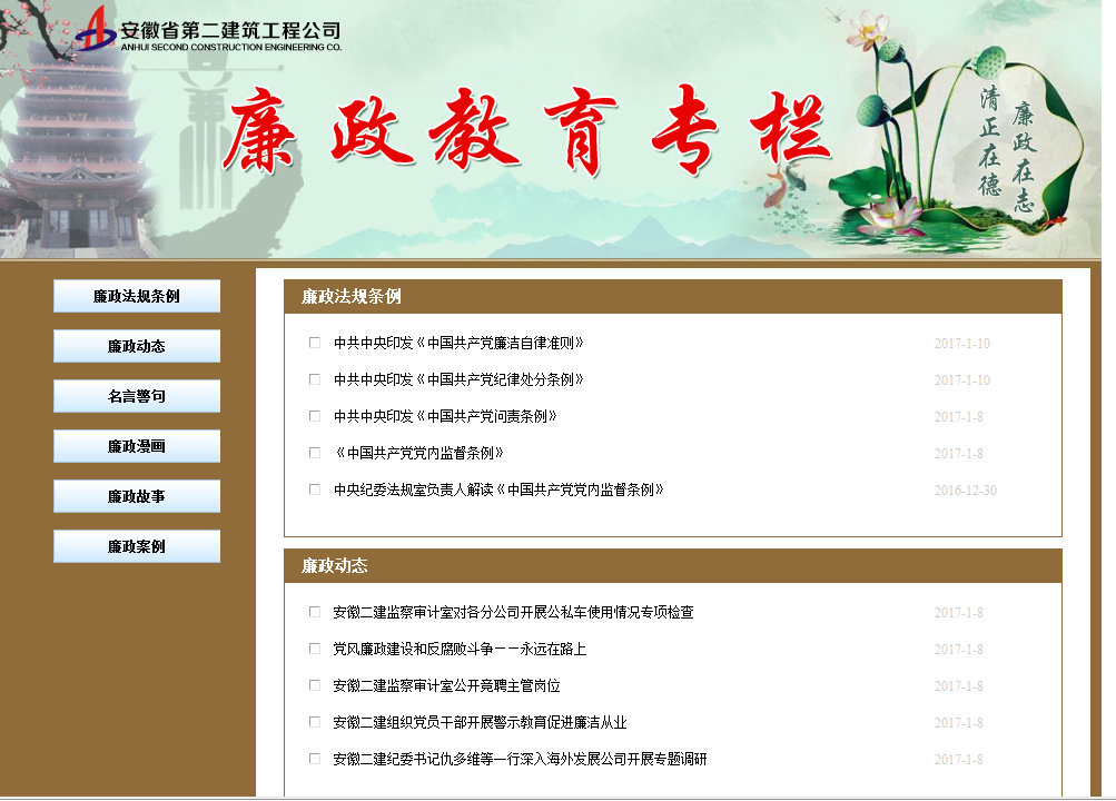 为实现廉政教育工作日常化、动态化,同时结合省国资委、集团纪委工作要求,经过前期的创意和材料收集,在信息部的大力支持下,公司纪委《廉政教育专栏》于2017年1月10日正式上线。