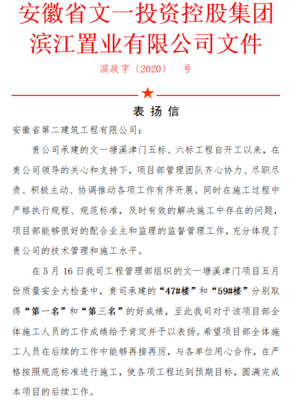 安徽二建文一·塘溪津门五标项目管理团队坚持疫情防控与复工复产两手抓、两手硬,管理团队齐心协力、尽职尽责、积极主动,保质保量完成施工任务。在5月16日安徽省文一投资控股集团滨江置业有限公司工程管理部组织的五月份质量安全大检查中,“47#楼”取得第一名的好成绩,获建设单位通报表扬。