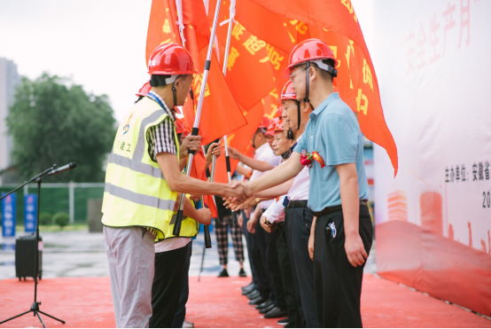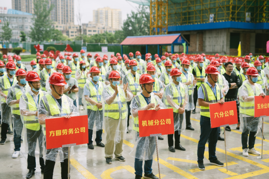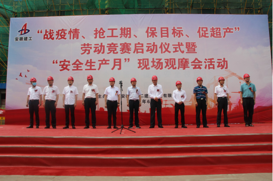 6月18日上午,安徽二建公司“战疫情、抢工期、保目标、促超产”劳动竞赛启动仪式在淮北国金华府(紫麟苑)项目现场举行。淮北市住建局唐成营处长、副处长张喜明、质监站徐栋副站长、淮北市相山区住建局吕鹏宇局长、淮北国金置业有限公司董事长许伟应邀出席仪式。公司领导班子成员、机关相关部门人员及所属各单位主要领导、分管安全领导等共计150余人参加活动,工会女工主任王俊主持启动仪式。