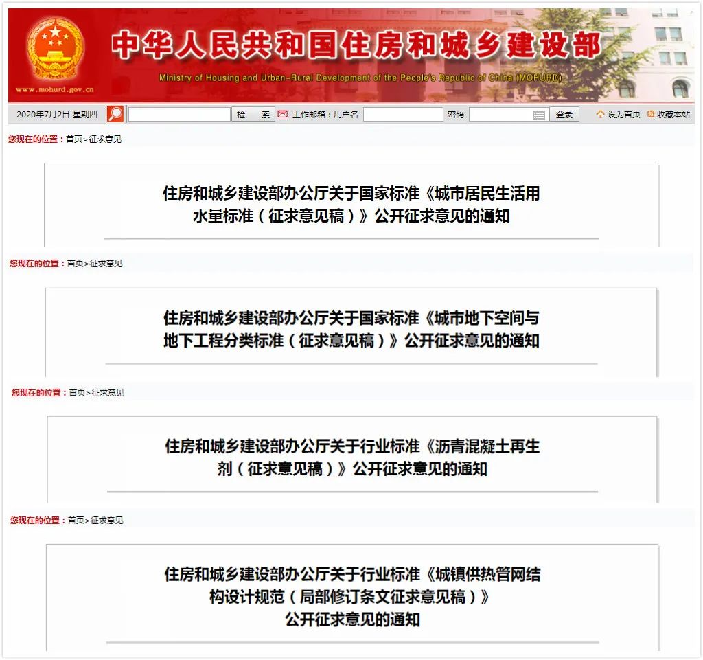 近日,国家标准《城市居民生活用水量标准(征求意见稿)》《城市地下空间与地下工程分类标准(征求意见稿)》和行业标准《沥青混凝土再生剂(征求意见稿)》《城镇供热管网结构设计规范(局部修订条文征求意见稿)》向社会公开征求意见。意见反馈截止时间为2020年7月27日。本标准的主要技术内容是:1. 总则;2. 术语;3. 用水量标准。本标准修订的主要技术内容是:1.增加城市居民生活用水量标准的确定原则;2.增加居民生活保障基本用水量;3.根据最新调研情况,按照人均水资源量,对城市居民生活用水量进行分级取值。本标准适用于城市地下空间开发利用的规划、设计、施工、使用、维护和管理及相关领域。本标准规定了沥青混凝土再生剂的术语和定义、要求、试验方法、检验规则、包装、运输和贮存等。本标准适用于市政道路及各等级公路沥青路面厂拌热再生和就地热再生时,为改善再生沥青混合料路用性能而掺用的再生剂。《城镇供热管网结构设计规范(局部修订条文征求意见稿)》主要修订内容包括:根据供热管网穿跨越(或贴邻)地段或设施的重要程度等因素,确定结构的设计使用年限和安全等级要求;根据供热管网管廊结构的环境条件和设计使用年限,补充完善结构的耐久性设计要求;适当提高结构安全度水准,与国家现行相关标准密切衔接和协调统一;补充顶进、盾构、浅埋暗挖等非开挖施工的管廊结构设计要求;补充完善直埋固定墩及检查室稳定验算公式等。用黑体字表示的条文为强制性条文,必须严格执行。