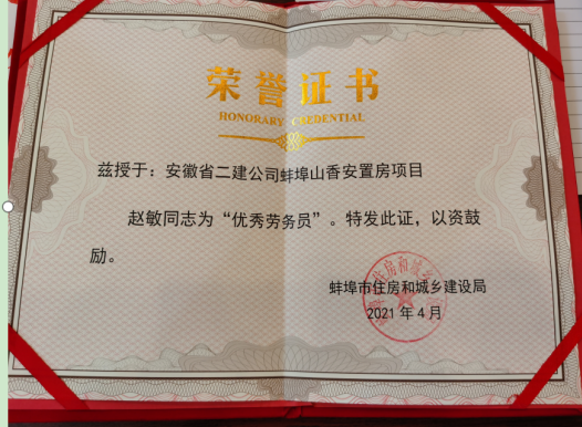 会议宣读了市住建局《关于表彰劳务用工管理先进单位和优秀劳务员的决定》,安徽二建一分公司蚌埠山香安置房EPC 项目劳资专管员赵敏亦荣获蚌埠市住房和城乡建设局颁发的“优秀劳务员”荣誉称号。