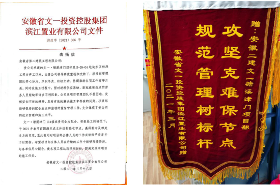 2021年3月31日,获安徽省文一投资控股集团滨江置业有限公司表扬,并授予锦旗。