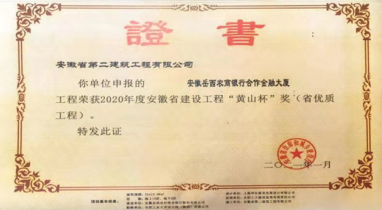 近日,由安徽二建一分公司承建的岳西农商银行合作金融大厦工程通过安徽省住房和城乡建设厅专家验收,获得2020年度安徽省建设工程“黄山杯”奖。