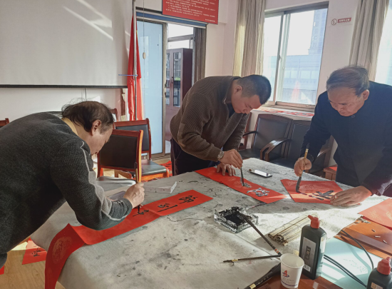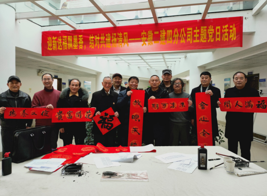 春节临近,为营造喜庆、祥和、热烈的新春氛围,丰富分公司文化内涵,弘扬中华优秀传统文化。1月29日下午,安徽二建四分公司党支部组织开展“迎新送福飘墨香,结对共建扬清风”写春联送祝福主题党日活动。活动邀请了安徽省新四军历史研究会淮海委员会会长张振山、副会长杨承愉,安徽省书法家协会会员牛中民、朱良谋等一行现场挥毫写春联,分公司机关近30余人参加了活动。