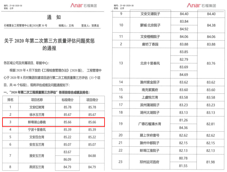 本次检测涉及33个项目、46个标段、39家施工单位,检测方采用随机抽取的办法,按照统一标准、统一尺度进行检测,检测数据实时上传,确保检测结果公平公正,评估分为工程质量实测实量、混凝土检测、安全文明施工、质量风险防控四个部分,检测结果如实反映各工程的实际施工质量水平。安徽二建公司承建的蚌埠湖山春晓项目在检测中综合得分85.66分,位列第三名,受到建设单位的通报表扬和奖励,为公司赢得了社会信誉,同时也为和石榴集团下一步合作奠定了坚实基础。