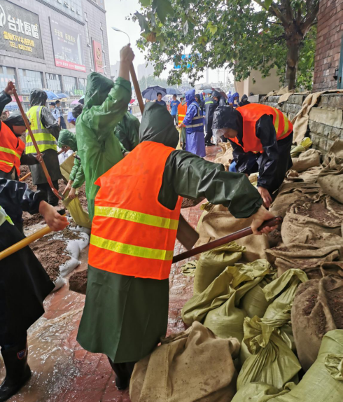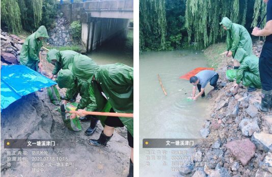一分公司文一·塘溪津门项目全体人员积极响应公司及建设单位的号召,立即展开了一系列的抗洪抢险工作。针对D-09-04地块金斗公园内部河道漫水至工地影响现场安全的情况,及时在河道漫水区域堆放沙袋,封堵漫水口,保河堤战洪水,抗洪抢险奋战一线。