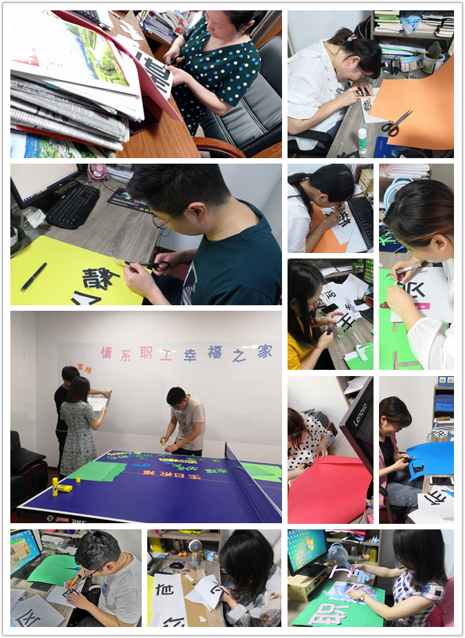 你看我剪的就是这么完美”“对哟,你就是如此优秀”,分公司机关全体员工齐动员,相协作互相配合,你裁我剪,你剪我贴,在跳动的文字中谈工作谈理想,其乐融融,现场呈一片祥和之气成果呈现,大家看着布置好的职工之家满眼都是成就的喜悦,脸上露出了愉快的笑容。