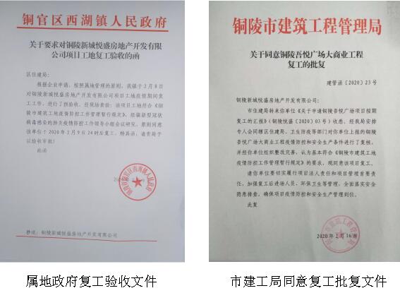 2月12日,铜陵市住建局安排专人会同铜官区住建、卫生防疫等部门,对项目部疫情防控及安全生产条件进行复核,认为基本符合《铜陵市建筑工地疫情防控工作管理暂行规定》的要求。2月17日,铜陵市住建局下发《关于同意铜陵吾悦广场大商业工程复工的批复》,同时提出要加强复工后进场人员环保卫生管理,全面落实安全隐患排查,确保项目疫情防控和安全生产管理到位。