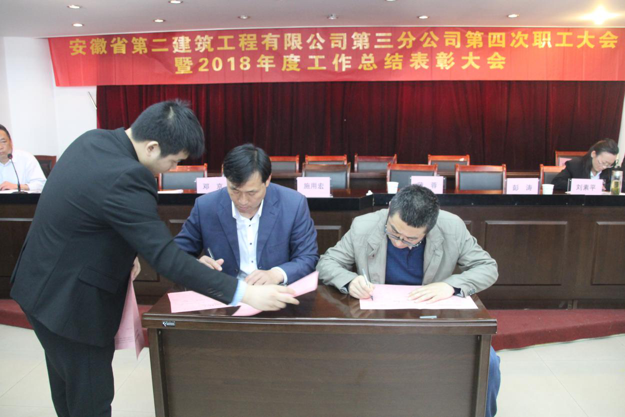 会上,公司党委工作部对分公司领导班子及班子成员进行民主测评,对后备干部进行民主推荐马福才经理和各项目经理签订目标责任状》、《劳动竞赛责任状》,为各责任主体完成全年指标下达了“任务书”、确立了考核依据;对过去一年在各自岗位上作出突出贡献的先进科室、项目及个人进行表彰,更好地发挥了榜样引领作用,促进形成崇尚先进、学习先进、争当先进的良好氛围。