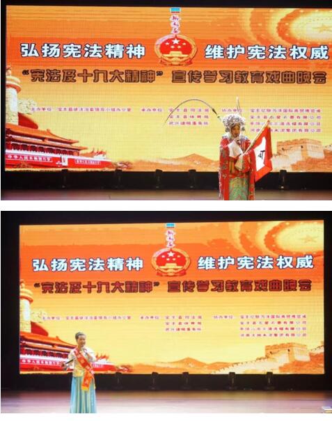 晚会在《梨园春》擂主演唱声中拉开帷幕。通过法治小品《找调解》《遵纪守法好处多》,法治戏曲《法治顺民心》《法官颂》等精彩节目,把法律知识和法治理念渗透其中,场内掌声阵阵。晚会还增设了法律知识有奖问答活动,通过主持人提问、观众抢答的方式,围绕“党章”“两学一做”“法律八进”等知识内容邀请观众参与互动,并向参与者发放法治小礼品,引导大家学法、守法、关心国家大事。