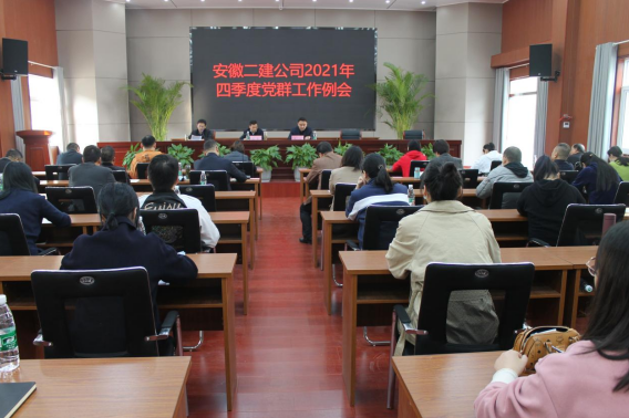 10月26日上午,安徽二建公司召开2021年四季度党群工作例会,公司党委副书记、工会主席王军,党委委员、纪委书记沈壮出席会议,机关党群部门全体人员、基层各单位党支部书记、团支部书记、综合办人员参会。会议由党委工作部主任施用宏主持。